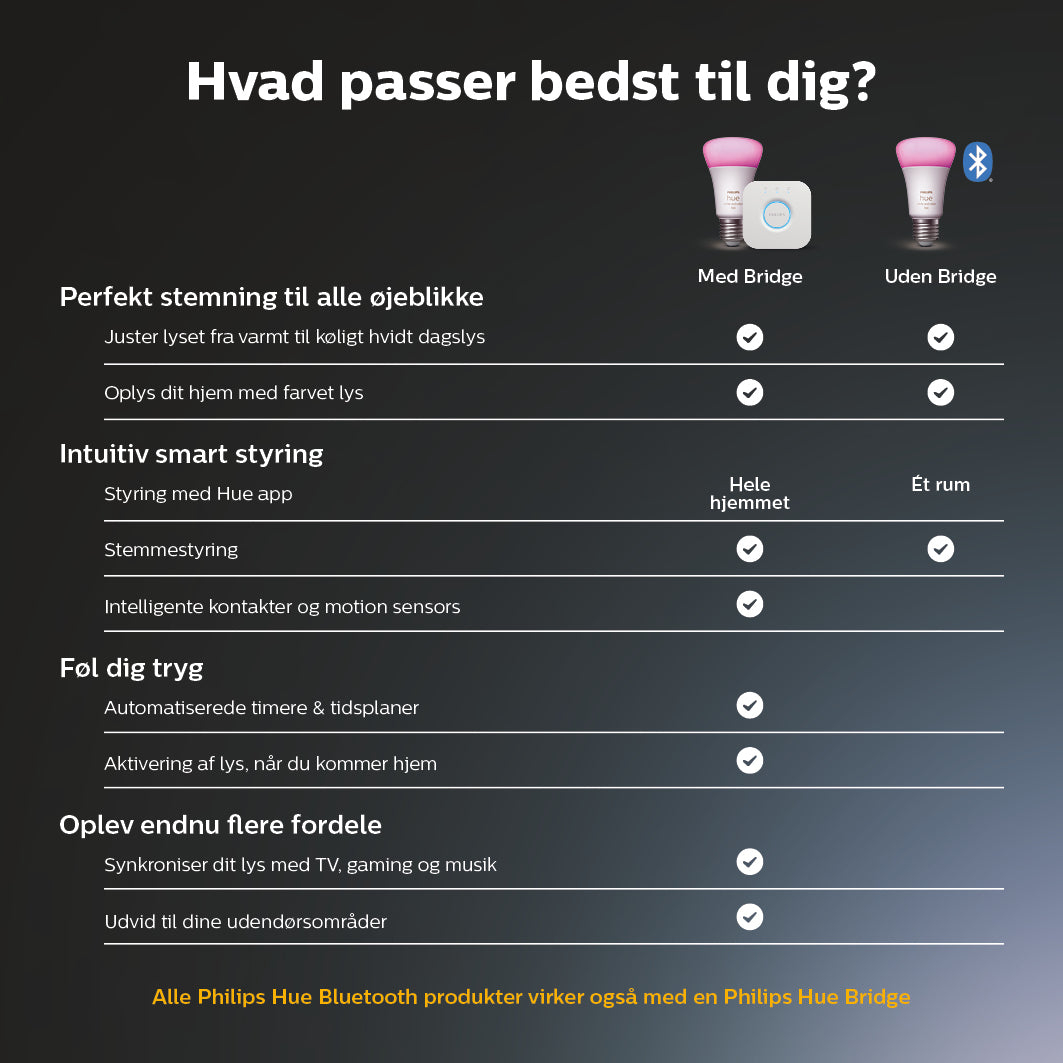Ønsker du derimod en nem måde at prøve Philips Hue systemet af på og komme godt i gang med et par intelligente pærer eller lamper, så er Bluetooth en rigtig god mulighed.