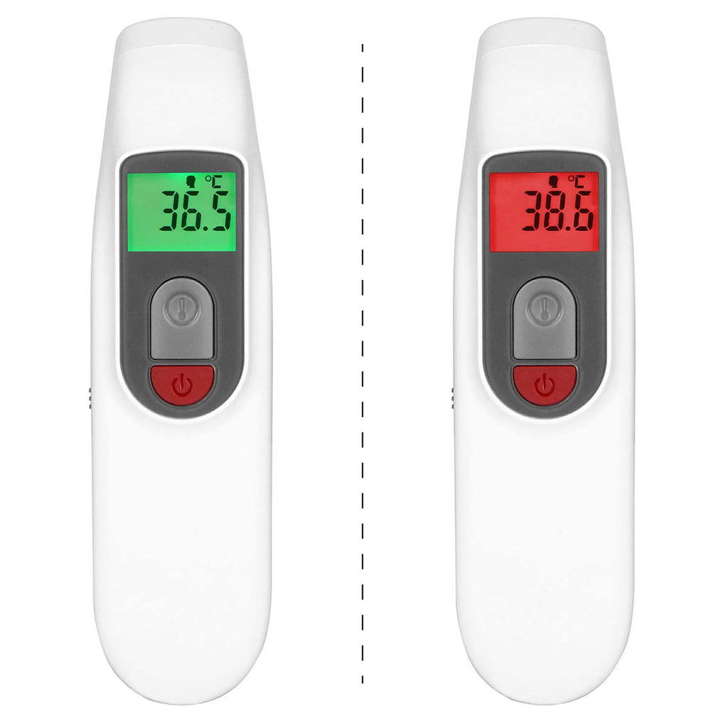 Dette fine infrarøde termometer måler temperaturen på panden. Det betyder: uden besværet med termometre i øret eller bagdelen, Målingen er hurtig og nem, og du kan indstille displayet til grader Celsius eller grader Fahrenheit. Hvis temperaturen stiger til over 37 °C (eller 98,6 °F), giver det infrarøde termometer dig besked på forskellige måder: Du hører en lyd, det grønne display bliver rødt, og du ser temperaturaflæsningen i displayet. Så selv dem, der ikke ved præcis, hvilken temperatur der indikerer feber, kan bruge dette termometer uden problemer.