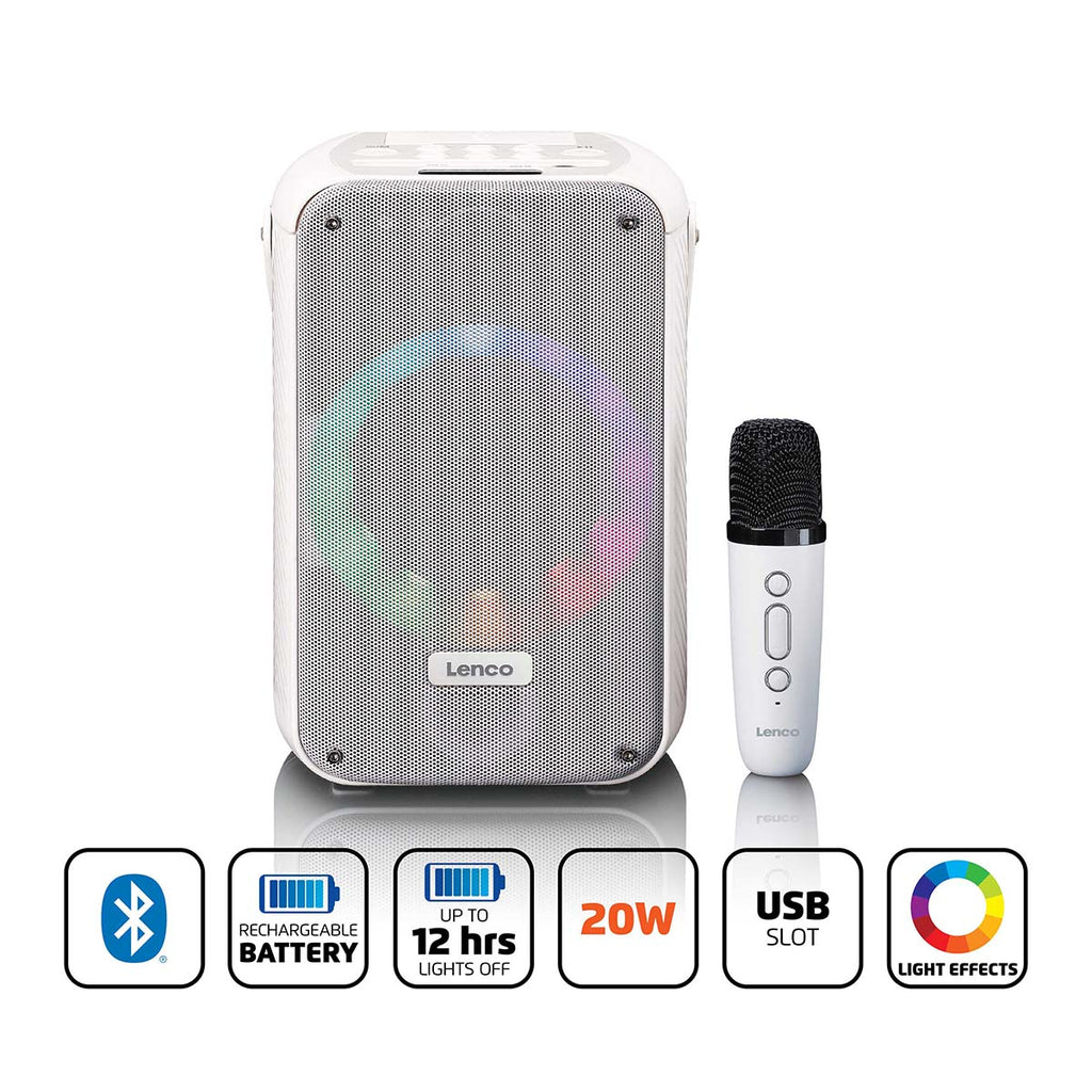 Lenco - Karaokeanlæg med Bluetooth®, genopladeligt batteri, trådløs karaokemikrofon og disco-LED-belysning Hvid - BTC-060WH