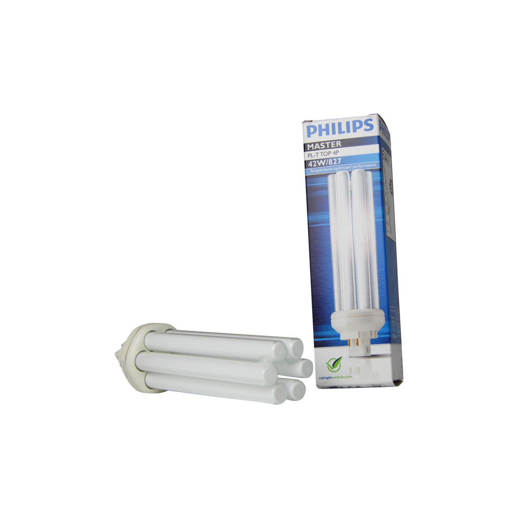 Philips MASTER PL-T Top 42W - 827 er et kompaktlysstofrør designet til energieffektiv belysning med en ekstra varm hvid farvetone på 2700K. Denne behagelige lysfarve skaber en indbydende atmosfære, hvilket gør den ideel til butikker, kontorer og andre kommercielle områder, hvor komfort og god belysning er vigtige faktorer.